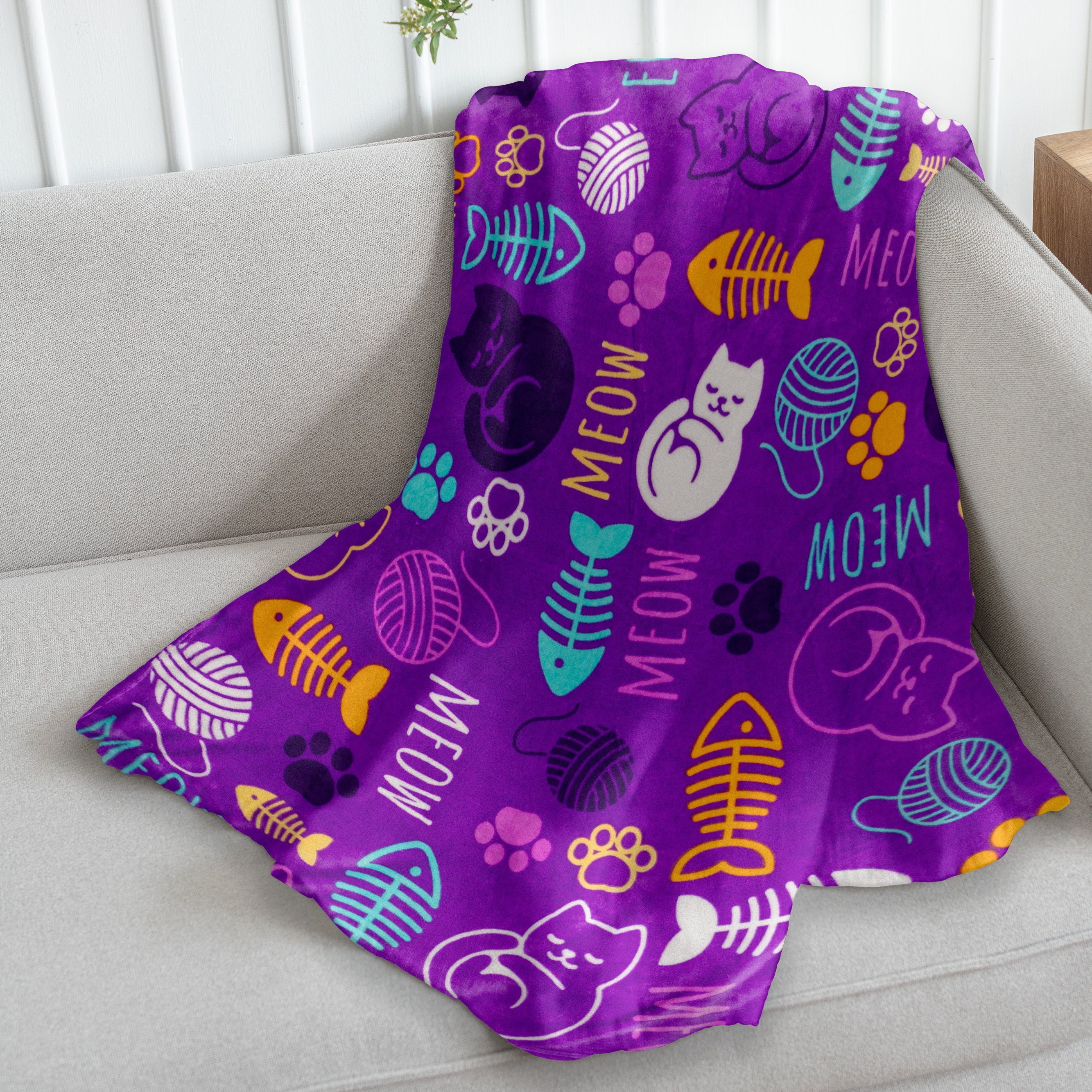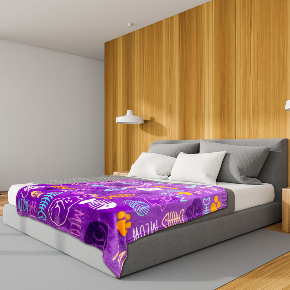 This Kitty Paws (Purple) Soft Plush 50x60in Blanket features beautiful bright colors. Blanket is made from a premium 100% Polyester fabric with a rich, soft plush feel. Machine washable convenience and rolled hem edging ensure long-lasting resilience in your home, all while staying warm and cozy!