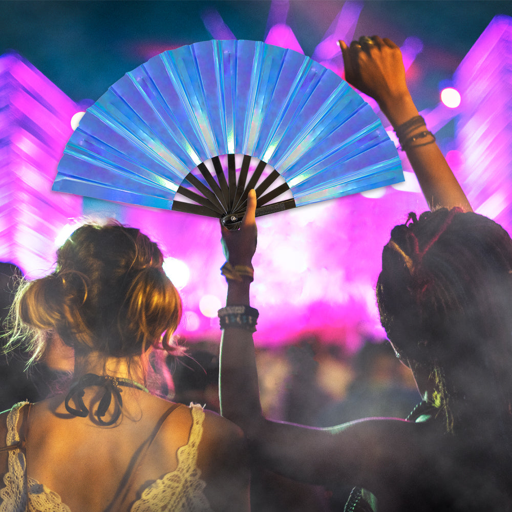 The Metallic Blue X-Large Fan offers a bold and vibrant accessory measuring 25 inches when fully opened. Crafted with durable polyester fabric stretched over 13 spokes, it features clear, digitally printed designs that catch the eye. The sturdy plastic handle with a smooth, screw-less rivet hinge ensures easy and reliable use, while the included charm loop lets you add a personal touch. Perfect for adding style and function at events or everyday moments.