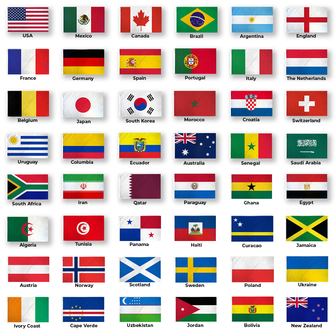 Our most complete and authoritative World Cup flag collection, featuring 48 countries across all major federations. Designed for large-scale displays, professional events, and institutional use.